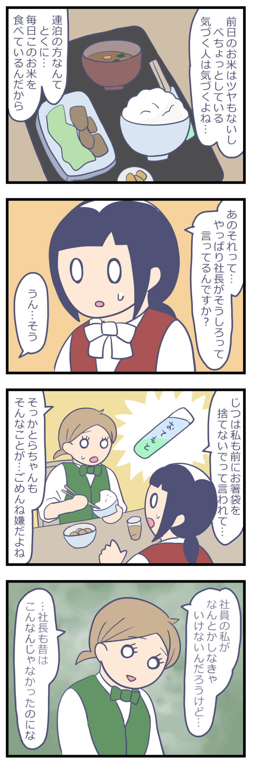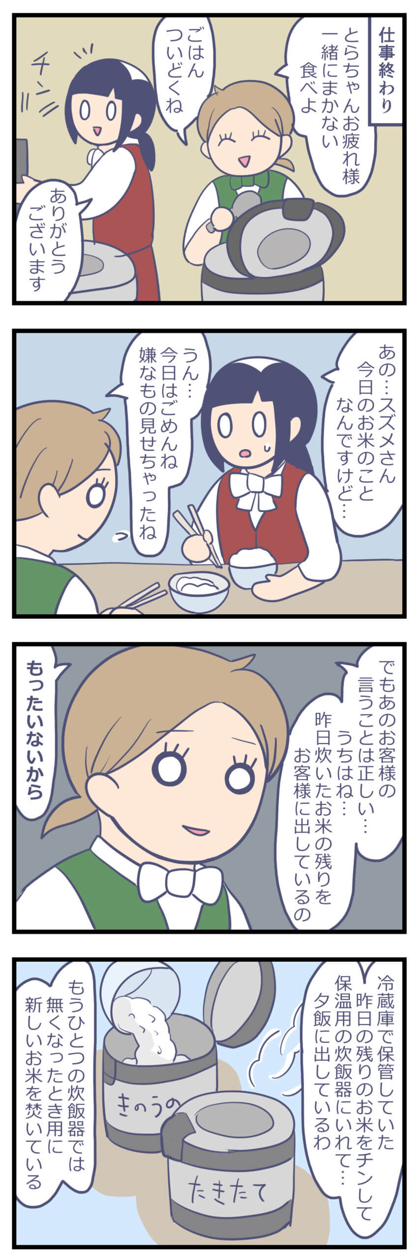 アルバイト先のボロホテルがやばかった㉗ 日常漫画 X Facebook LINE コピー 2025.10.02 「もったいない」その理由だけで、前日のお米をお客様にだしていた。 一度冷蔵庫で保管したお米って、匂いが変だったり、硬かったり… 炊き立てとはずいぶん違う味と食感になってしまいます。 しかもお客様に古い米だということを気づかれてしまっている。 最悪の状況になってしまっています。 そこまでしてもったいないを極めなければならないのか…。 社長はどうやら、昔と変わってしまったみたいだけど…? 次回から社長の過去編をお送りします。