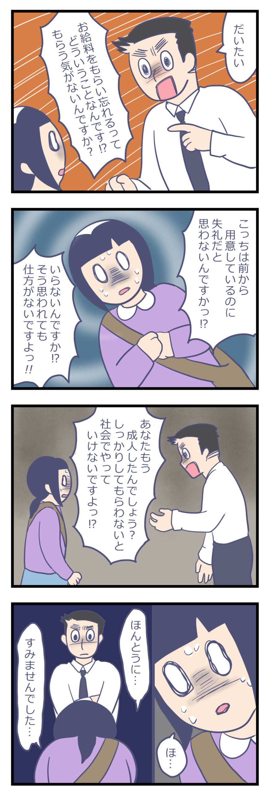 アルバイト先のボロホテルがやばかった㊶ 日常漫画 X Facebook LINE コピー 2025.11.20 お給料を受け取り忘れたのは私なので、何も言えませんでした。 たしかに、私失礼だよね…と。 でもハト太郎は、自分が電話越しに怒られたので急に態度を変えたのです。