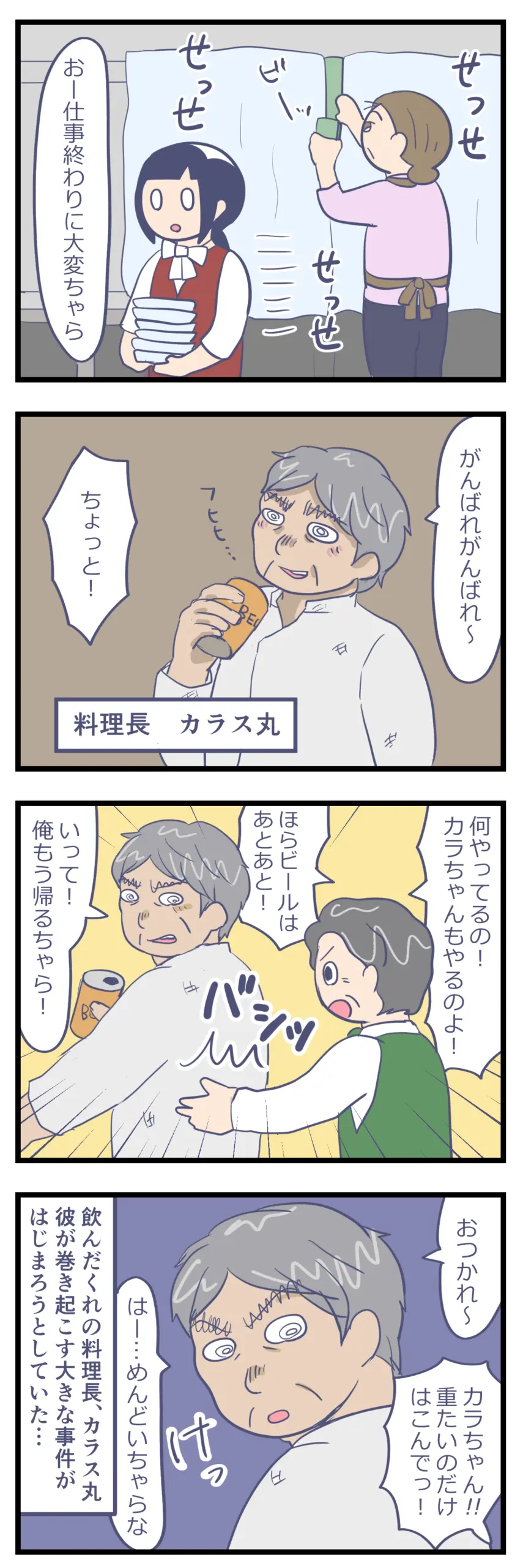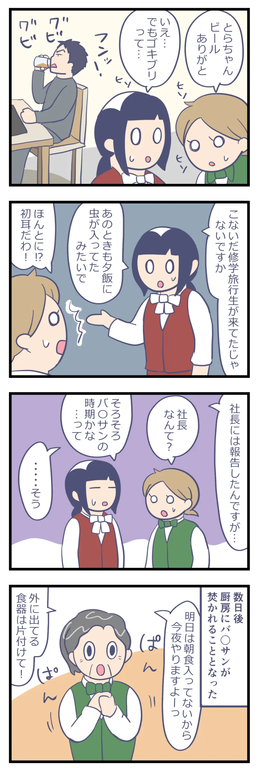 アルバイト先のボロホテルがやばかった㊼ 日常漫画 X Facebook LINE コピー 2025.12.11 事件が起こってから動くのではなく、起こる前に虫対策をしておいてほしいものです。 さて、このホテルのいちばんの問題児、カラス丸が巻き起こす大事件の始まりです。