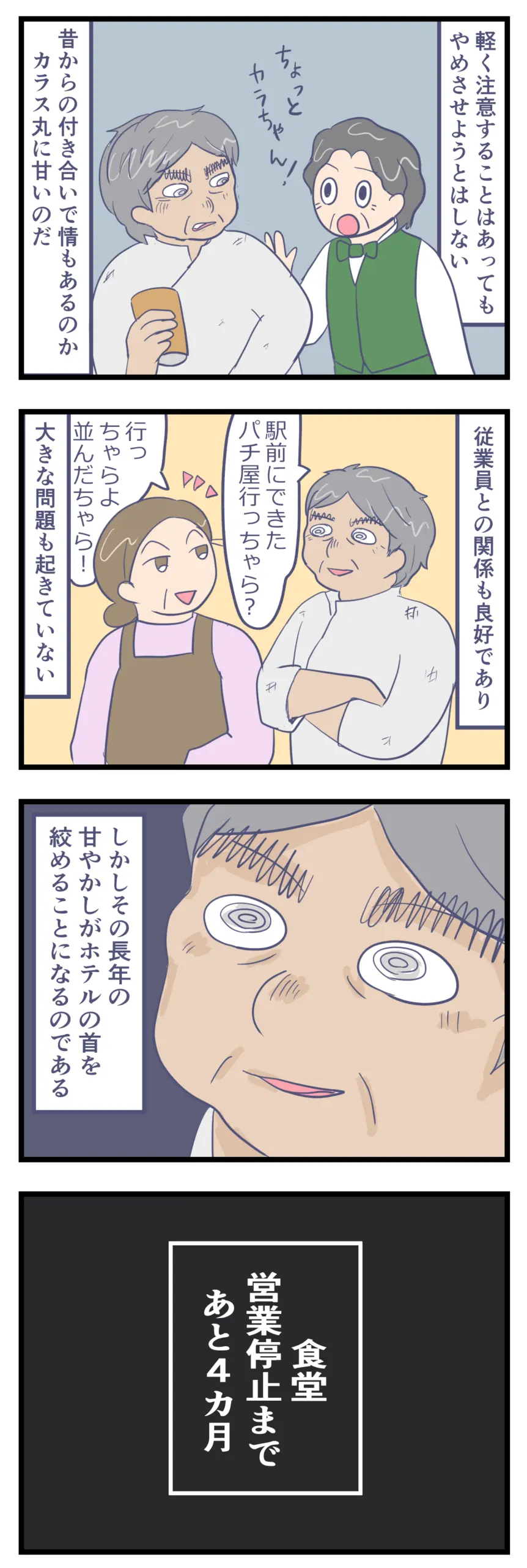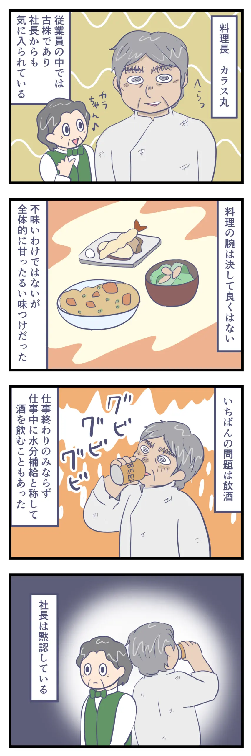 アルバイト先のボロホテルがやばかった㊽ 日常漫画 X Facebook LINE コピー 2025.12.15 前にも少し登場しましたが、カラス丸は飲酒癖があり、就業時間内でも酒を飲んでいることが多々ありました。 これまではそれでも問題なく過ごせていましたが…それもついに壊れる日が近づいてきたようです…