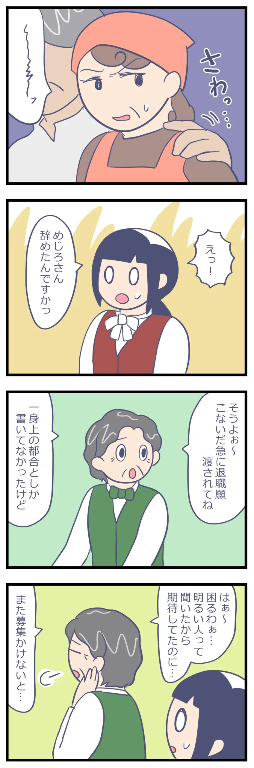アルバイト先のボロホテルがやばかった(51) 日常漫画 X Facebook LINE コピー 2025.12.25 めじろさんはモズ山さんに何度か相談していたようですが、なにも対処がされなかったのか、 めじろさんは入って1カ月で辞めてしまいました。 直接カラス丸のセクハラが原因で辞めたのかはわかりません。 ですがめじろさんがカラス丸になんらかの被害を受けていたことは事実です。 とても良い人だっただけに、辞めてしまったのが残念ですし、めじろさんを守れなかったことを悔しく思います。 けれど、すぐに辞めていっためじろさんは、正解なのです。 こんな問題ばかりの職場に、残る意味などありませんから。
