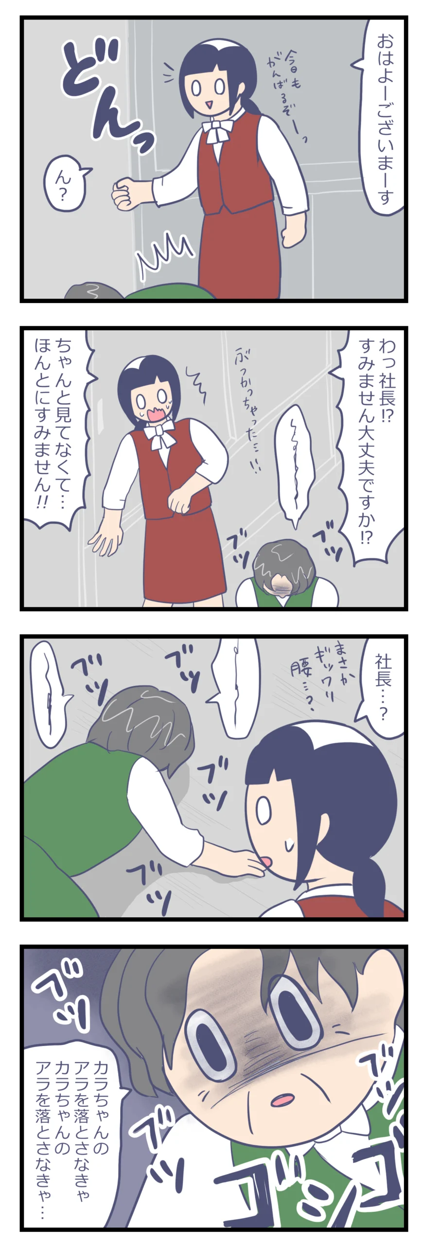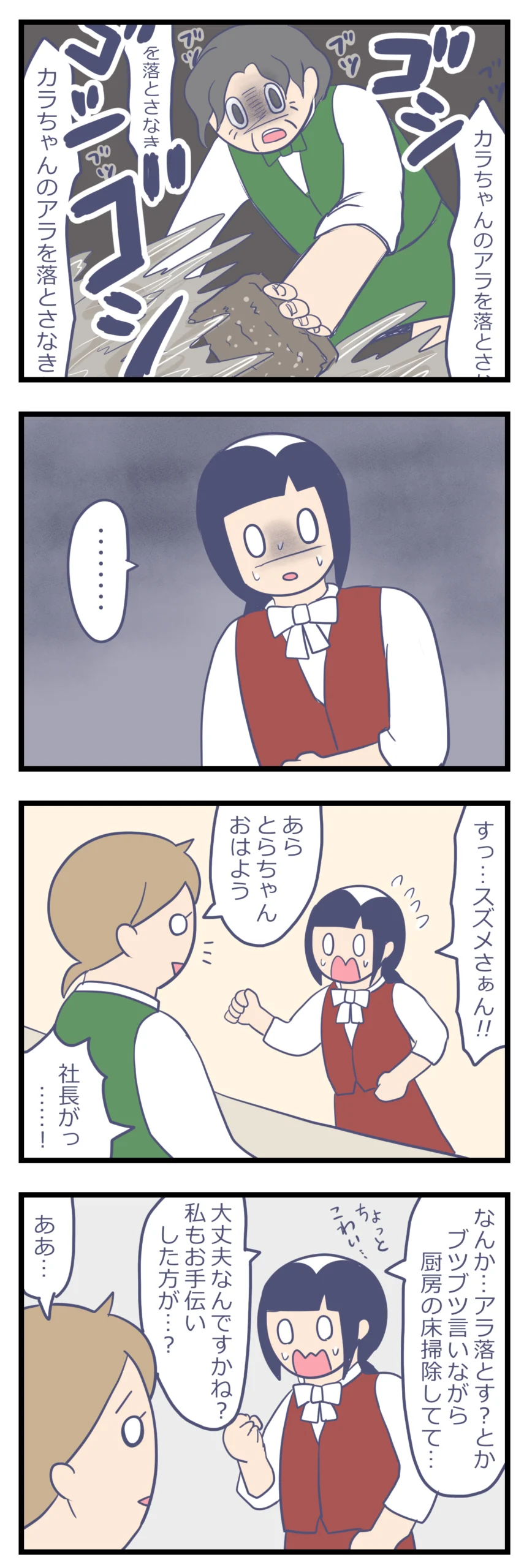 アルバイト先のボロホテルがやばかった(74) 体験談連載漫画 X Facebook LINE コピー 2026.03.19 出勤すると、社長がブツブツ言いながら、必死で厨房の床を掃除していました。 一瞬ギョッとするような光景で、一体何事かと怖くなりました。