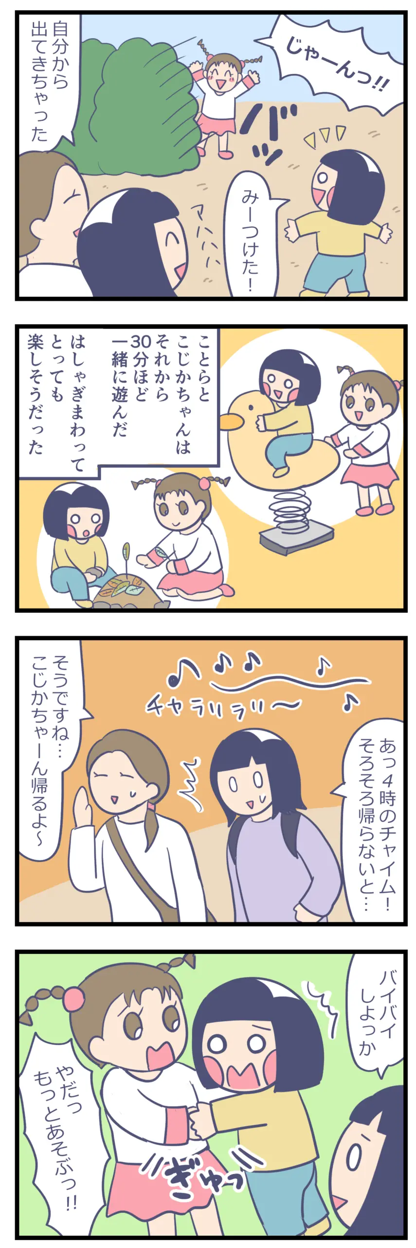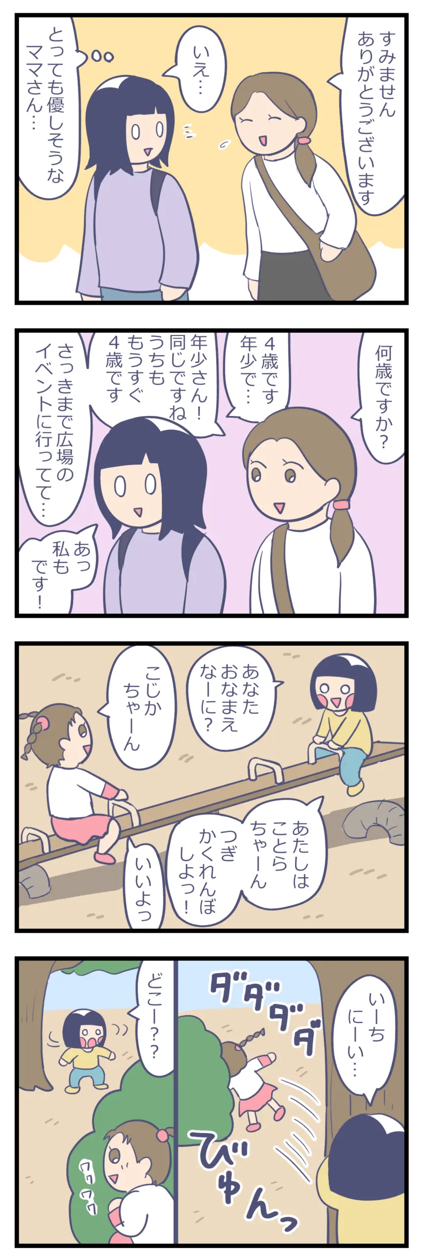 こどもの友情②おともだち 子育て漫画 X Facebook LINE コピー 2025.12.16 こどもってすぐに仲良くなれてすごいなぁって思う。 こじかちゃんはことらと似ていて走り回ってキャーキャー遊ぶタイプ。 気が合う2人だからこそ、とっても仲良くなれたんだなぁと思います。 こじかちゃんのママも、初対面の私に優しく話しかけてくれて…人見知りの私からすると、自然に会話を始められる人って本当に尊敬するし、私もそうなりたい。 こじかちゃんのママとお話ができて、私も楽しい時間を過ごしました。