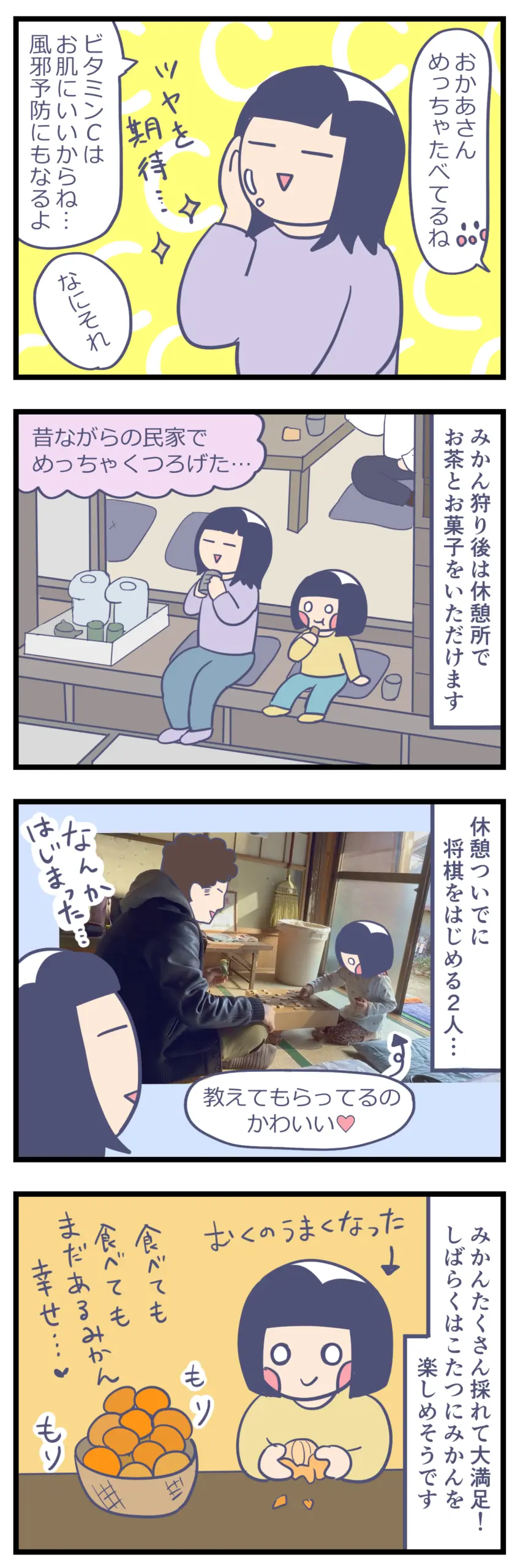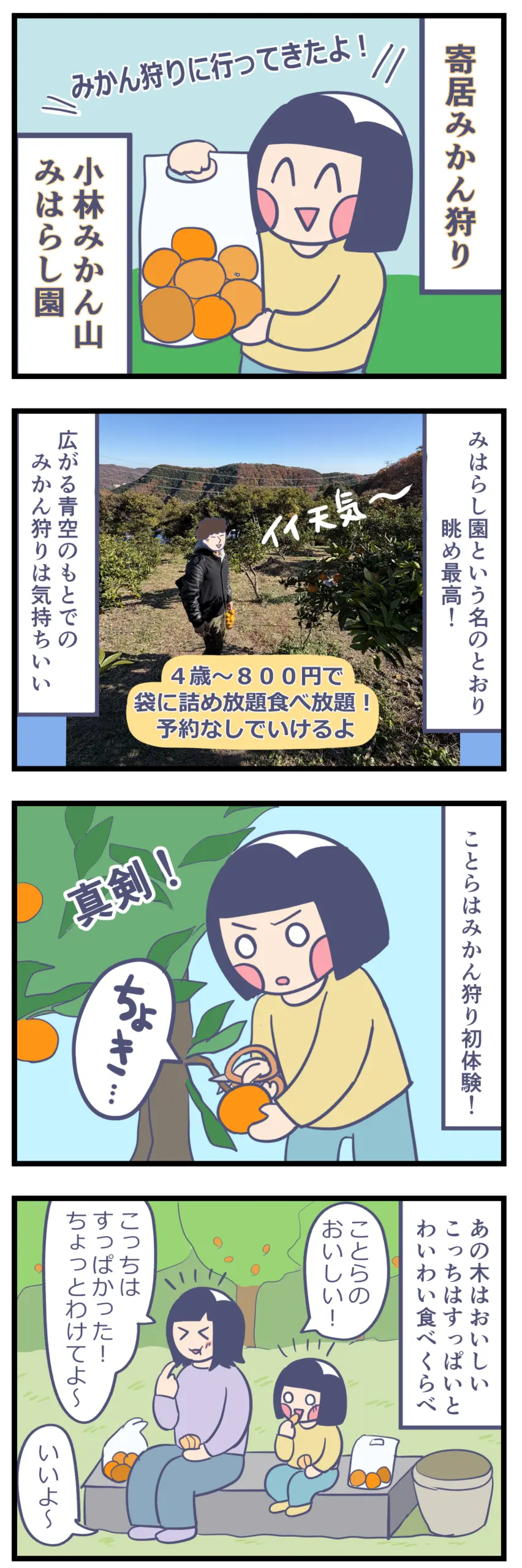 採ったみかんを分け合ったり、あっちの木がおいしい、こっちの木は酸っぱいとあーだこーだ言いながらみかん狩りをする時間はとても楽しかったです。