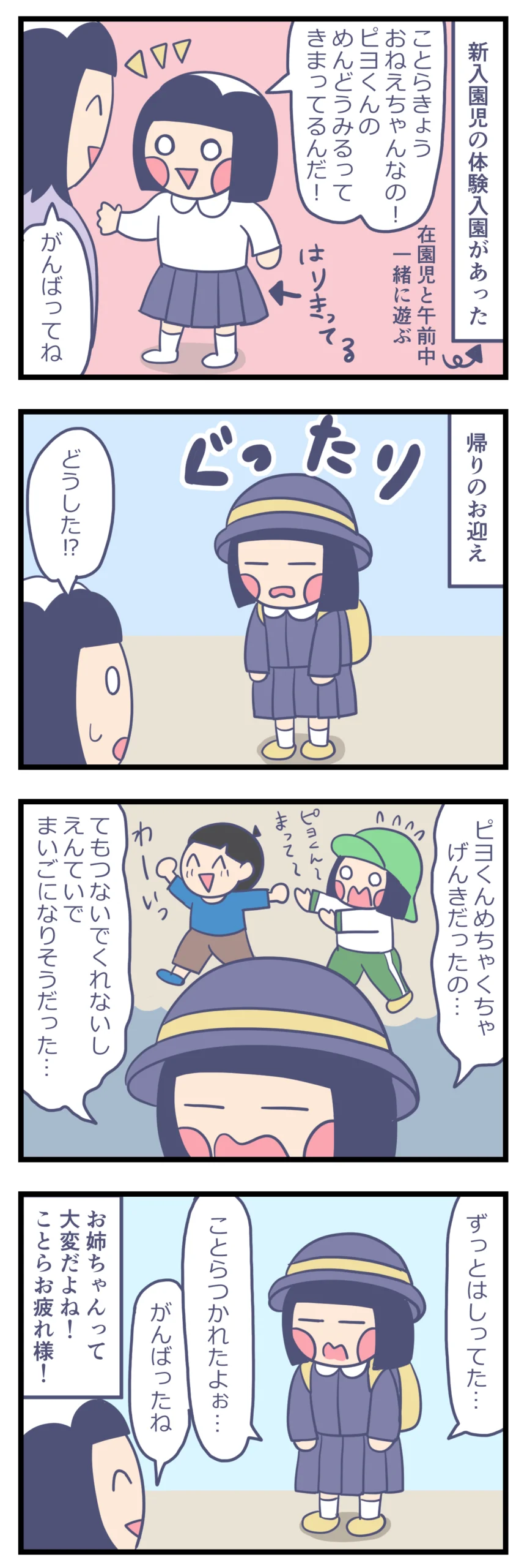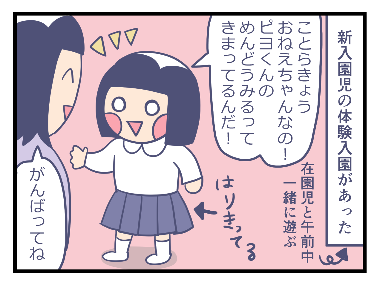 新入園児の面倒をみたよ! 子育て漫画 X Facebook LINE コピー 2026.03.13 幼稚園で、新入園児の体験入園がありました。 3、4人でグループになって、新入園児の面倒を見たようです。 ことらが疲れるなんて珍しく…よっぽど疲れたのだろうなと思います。 先生が、「元気な男の子だったんですけど、ことらちゃんはまずは見守る姿勢で、相手のやりたいことをやらせてあげて、それから教えてあげる、って姿勢でやってました。」 と教えてくださり、ことらおねえさんらしく頑張ったんだな~とその努力が伺えました。 見守るなんてなかなかできることじゃないぞ!頑張ったね!!