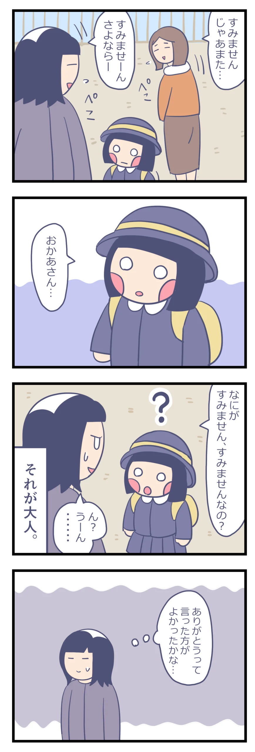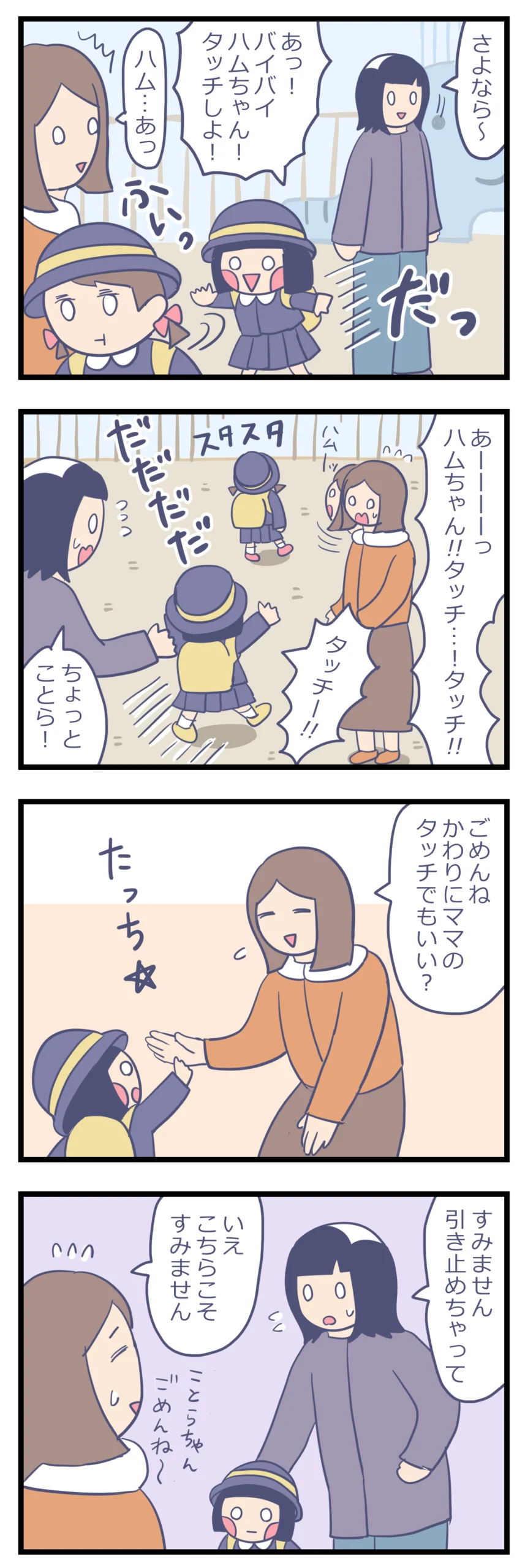 たしかに、ことら目線でみると、「おともだちのママがタッチしてくれたのになにがすみませんなのだろう…悪いことでもあったのか??」