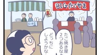 みなさんならどっちのたこ焼きを買いますか?これは私が小学生のころ、情けでたこ焼きを買って後悔したお話です。少し前に、圧に負けてたこ焼きを買って後悔した漫画を描きました。そのときに「あれ?たこ焼きで失敗したこと子どものころにもあったぞ?」と思...